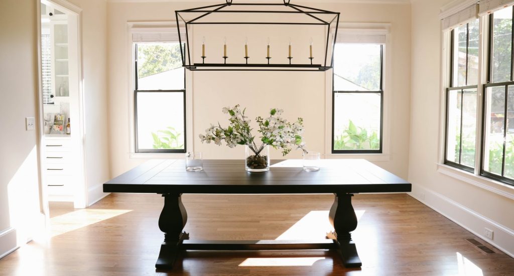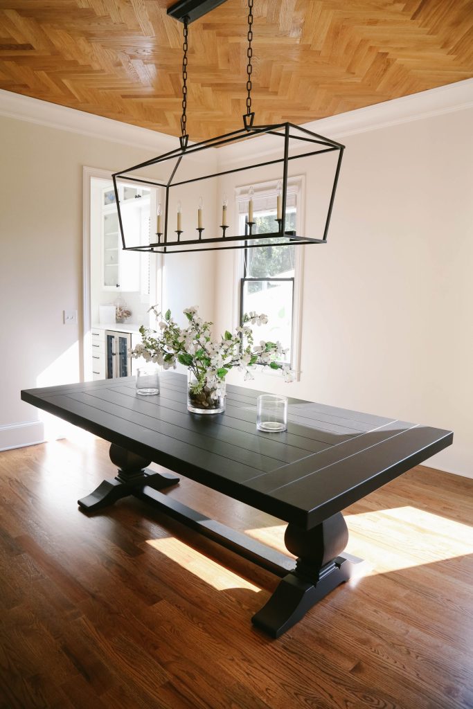 In a lot of houses, the dining room has significant molding; be it on the walls, the ceiling, or both. There’s nothing at all wrong with that. We just didn’t want a lot of wall molding in our home and planned to install beams on the ceiling in our living room, so we didn’t want molding on the dining room ceiling. Instead, we opted for a statement hardwood installation. It’s 3 1/4″ white oak laid in a herringbone pattern, sanded, and finished with a clear finish. The color beautifully compliments the un-stained cedar beams in our living room and the variety of wood tones between it and the hardwood floor creates richness. No molding needed. We absolutely love it!