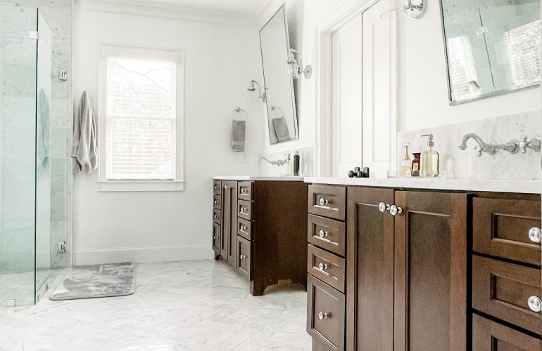 (Master bath) We are on the brink of potty training our first born. And I've made a terrible realization. Only one of the beautiful bathrooms I designed in our home is truly potty-training appropriate (i.e., has LOTS of room around the toilet and a ceramic tile floor). I cringe at the idea of repeatedly scrubbing…