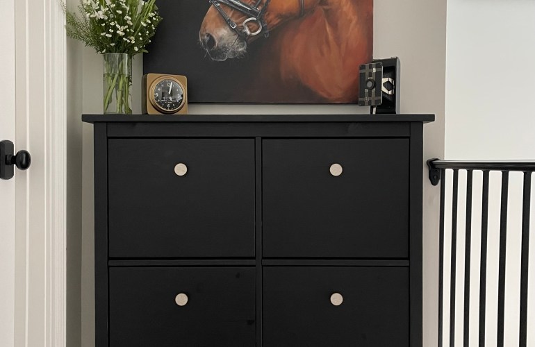 If you google "Ikea Hemnes Shoe Cabinet Hack" you'll get a number of blog posts that discuss how quickly and easily the author transformed a simple Ikea Hemnes shoe cabinet into a beautiful statement piece of furniture. So when we decided to create a welcoming "entryway" on a blank wall outside our upstairs guest bedroom…